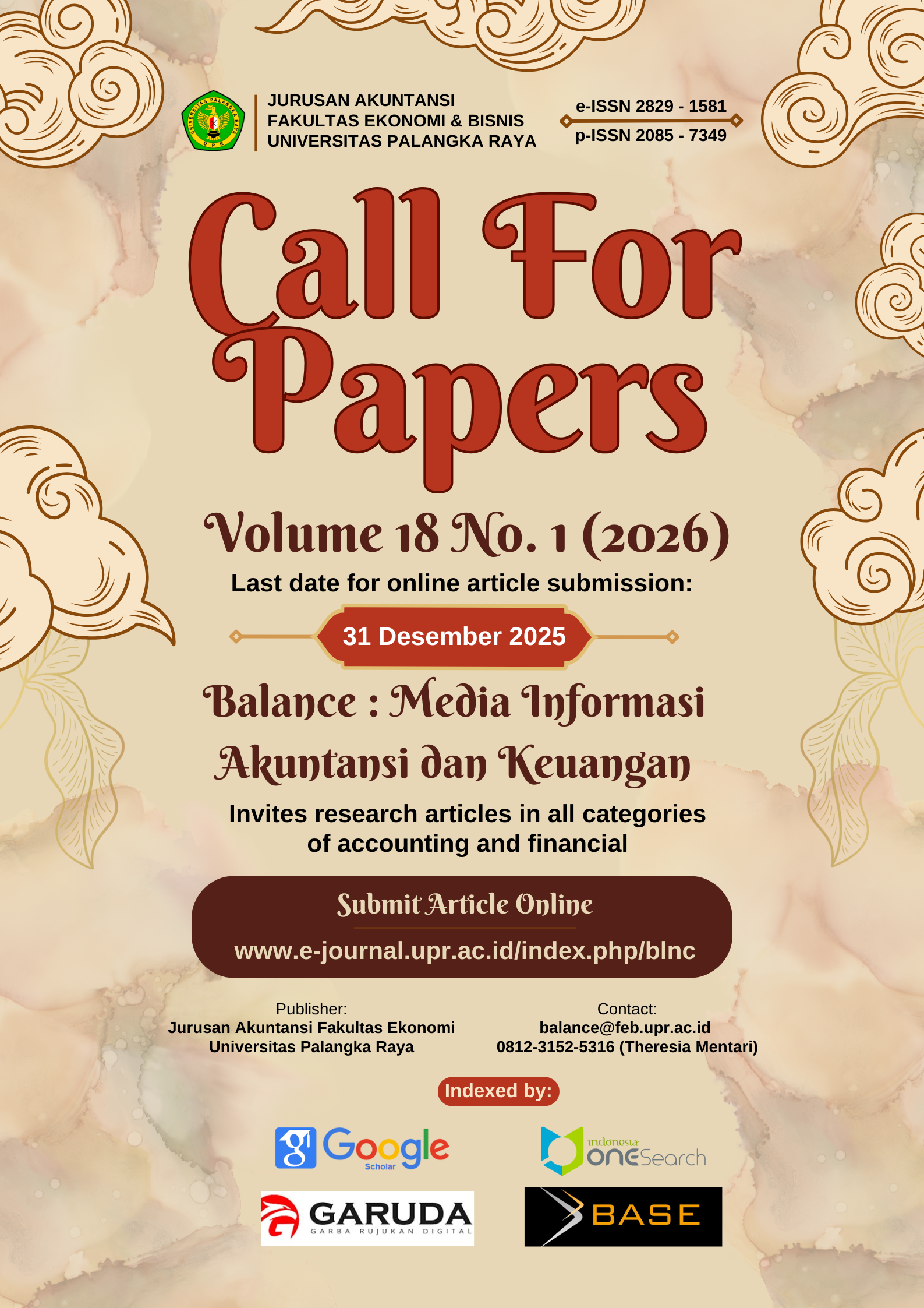 Balance: Media Informasi Akuntansi dan Keuangan is a scientific journal published by Universitas Palangka Raya and aims to publish empirical and theoretical study articles in the field of accounting. This journal is published 2 times a year in January and July.